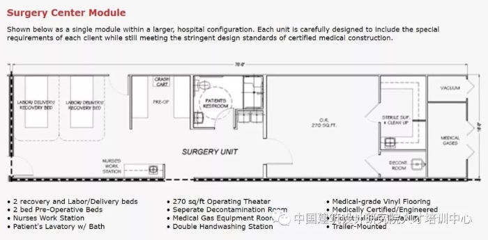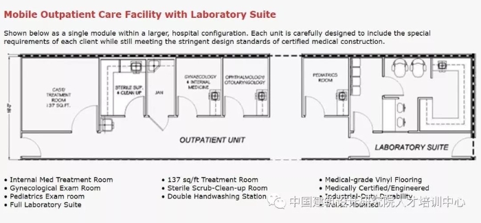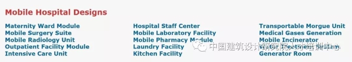 这种装配式医院研发多种成品模块可自由选择进行组合拼装,包括:产房模块、移动手术室、移动放射科、门诊模块、重症监护室模块、医院职工中心、移动实验室设施、移动药房模块、洗衣设施、厨房设施、移动式停尸房、医用气动系统、移动式焚烧炉、水处理系统、发电机房等。