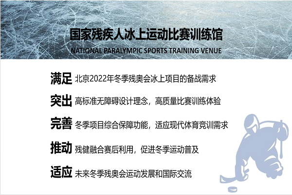 作为全国唯一的专门建设服务于残疾人冰上项目的比赛训练馆,国家残疾人冰上运动比赛训练馆以符合残疾人运动员和残疾人观众需求、无障碍与人性化、体现对残疾人的人文关怀为关键设计目标,为国家冰上项目备战冬残奥会提供更好的保障,成为展示我国残疾人事业发展的重要窗口。