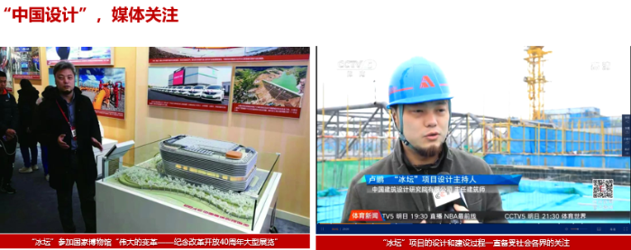 2020年,冰坛首先竣工。作为第一批开工建设的冬奥场馆,冰坛作为全国体育类建筑的唯一代表先后获选参加国家博物馆“伟大的变革——纪念改革开放40周年大型展览”和香港历史博物馆“现代化之路——新中国七十年”重要展览,受到全国主流媒体的采访和报道,展现了“中国设计”的自信。中央电视台、北京电视台、新华社、北京晚报以及网络直播平台多次报道了“冰坛”的设计和建设过程,为大众了解冰上运动建筑的设计和建设过程打开了窗口,增强了公众对设计科研的认识,展示了建筑设计师专业敬业的职业风采。