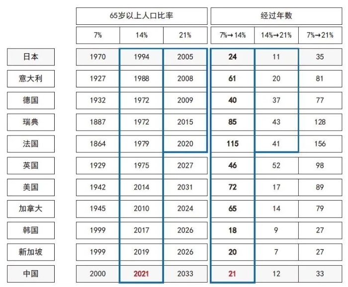 1 世界典型国家老龄化进展速度比较